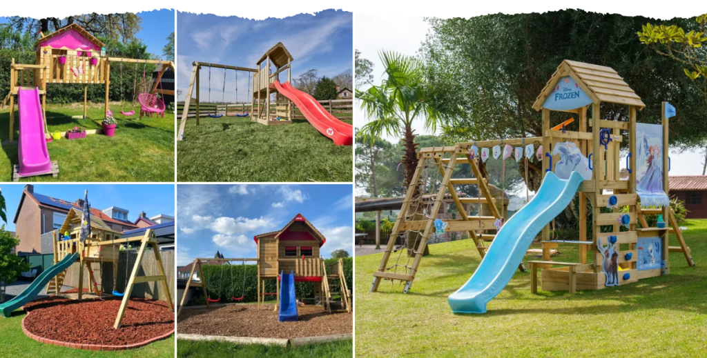 - Spieltürme und Klettergerüste: Diese bilden oft das Zentrum des Gartens und kombinieren Rutschen, Kletterwände und Sandkästen.