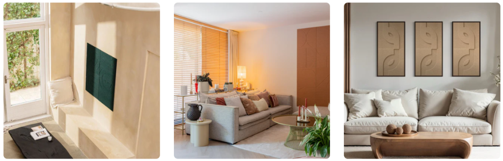 - Akustik-Wandbilder: Gerahmte Kunstwerke aus Filz, die wie klassische Gemälde wirken, aber aktiv den Schall dämpfen.